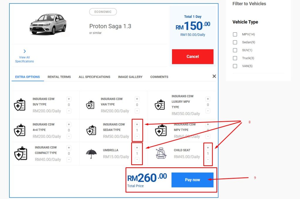 8. Add Insurans / Umrella / Child Seat (if required)