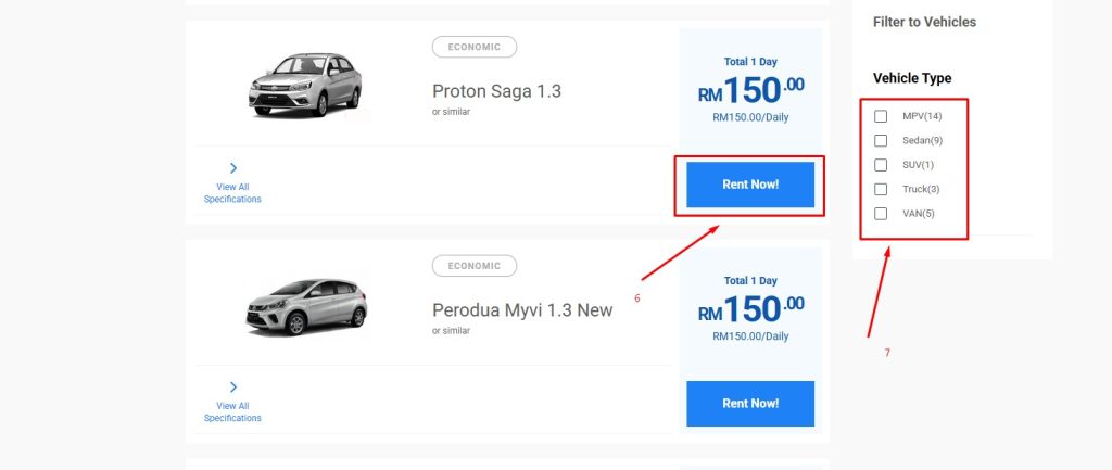 6. Click Rent Now button to select the car
